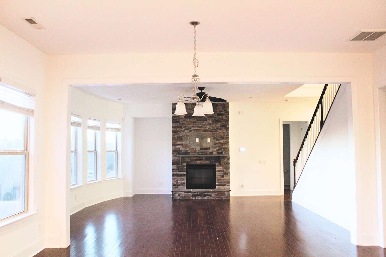 Inside, the main level features a spacious living room with a stone fireplace, tall ceilings, and beautiful curved wall fire-place TV area with oversized windows that bring in abundant natural light. The chef's kitchen includes a large center island, stainless steel appliances, generous cabinetry, and seamless flow into both the breakfast area and formal dining room ideal for entertaining throughout the year.